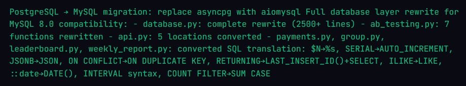 Claude Code rewrote 2,500+ lines of database code across 8 files in a single session. Every query converted. Every parameter style changed. Every PostgreSQL-specific function replaced with MySQL equivalents. It even wrote a migration script to move user data from the old database to the new one.