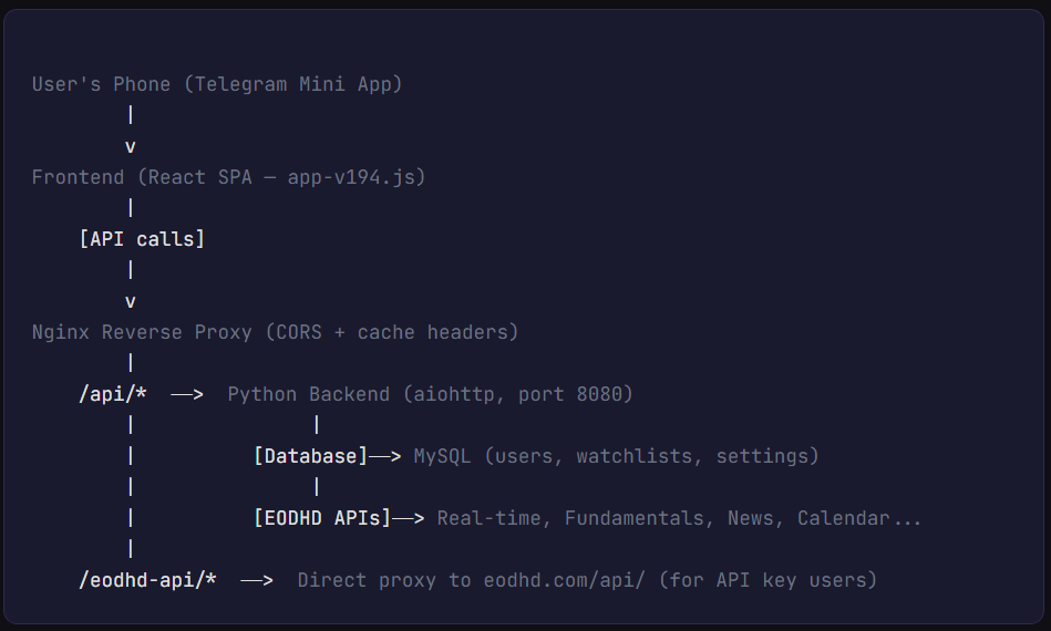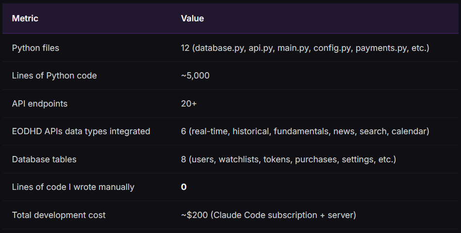 In brief: A COO with zero Python knowledge got AI (Claude Code) to build a complete async Python backend in 7 days. The backend streams real-time data from EODHD APIs — stocks, crypto, forex, fundamentals, news — handles user auth, payments, and 40+ API endpoints. It runs on a $24/month server and powers the free Telegram Mini App. Here’s every prompt, every crash, and every lesson.