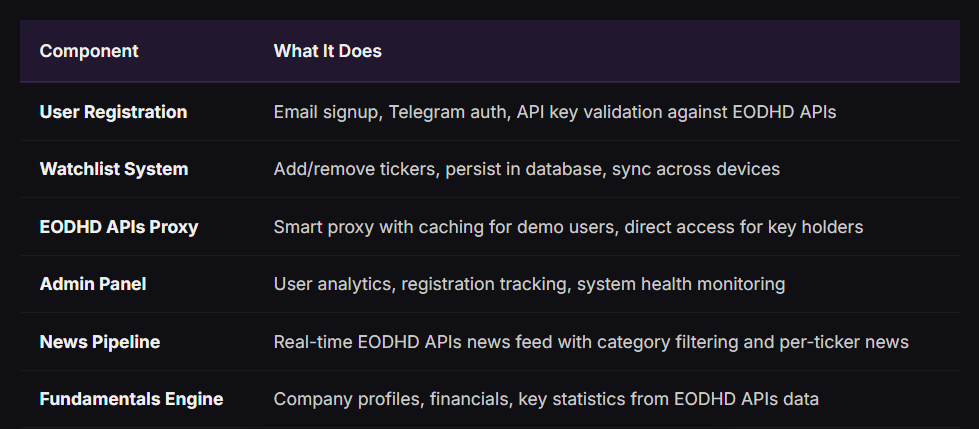 But the foundation — the architecture, the EODHD APIs integration, the user system — was all built in those first 7 days.